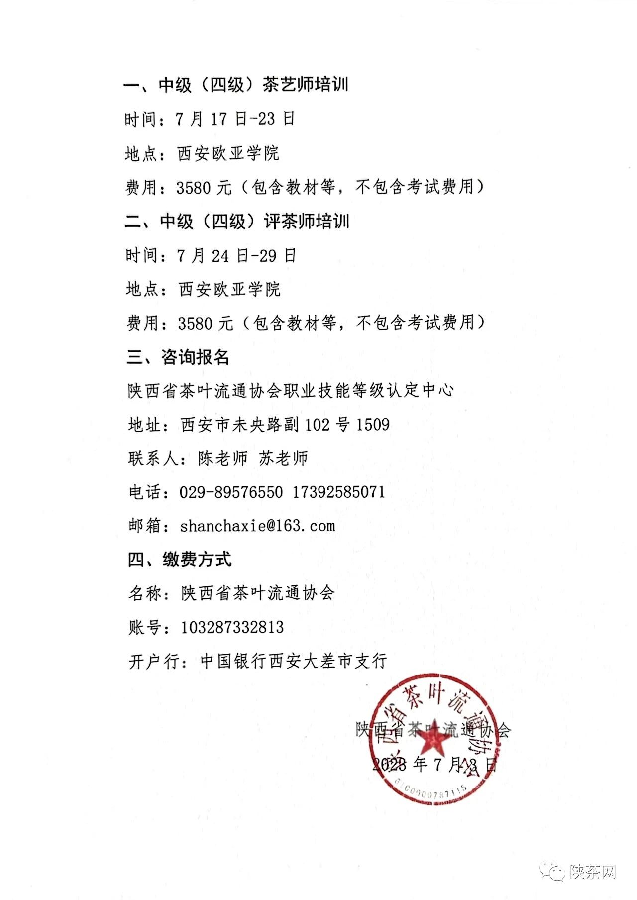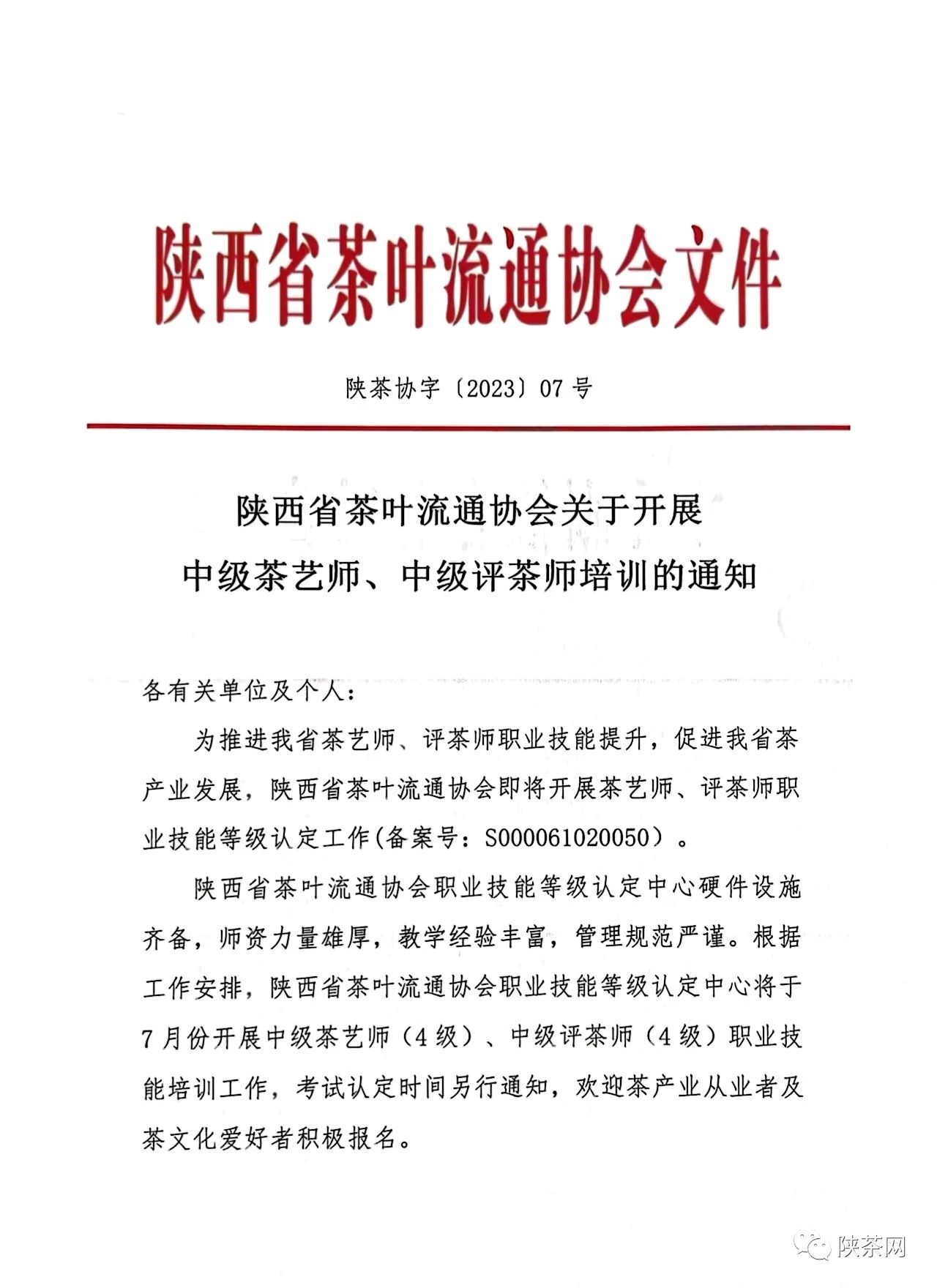 陕西省茶叶流通协会关于开展中级茶艺师、中级评茶师培训的通知